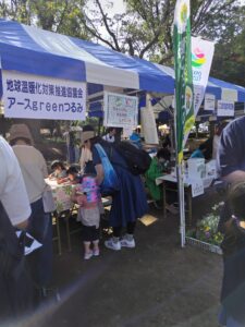 いきいきフェスタが開催され横浜市地球温暖化対策推進協議会は家庭でできる脱炭素行動アンケートを、のじま自然観察探見隊は木のキーホルダーのワークショップを協働で出店しました。